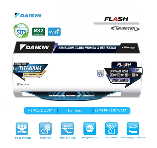 FTKQ20UVM4 Daikin AC Flash Inverter FTKQ Series 0.75 PK 6,800 Btu/h ( 2.0 Kw ) tingkat Hemat Energi ***** ( 5 Bintang )adalah sistem pendingin udara yang dirancang dengan fitur-fitur unggulan untuk memberikan kenyamanan dan efisiensi energi yang optimal. Fitur Daikin FTKQ20UVM4 adalah Powered Inverter, Air Purification, Filter PM 2.5* , Wide Angled Lattices, Standby Power, Freon R32, Mode Low Watt, Efficiency Peformance, Mode Econo, Outdoor Anti Korosi, Super PCB, Self Diagnosis, Daikin Smart Wifi Control*, dan Auto Restart.