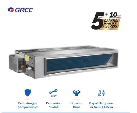 GUD50PS/A-S Gree AC Ceilling Duct Standard dengan kapasitas pendinginan 2 PK atau 17.000 Btu/h sistem pendingin udara yang efisien dan andal untuk aplikasi plafon. AC ini dilengkapi dengan berbagai fitur canggih yang membuatnya menjadi pilihan ideal untuk mengatur suhu ruangan dengan nyaman. Dengan teknologi defrost pintar.